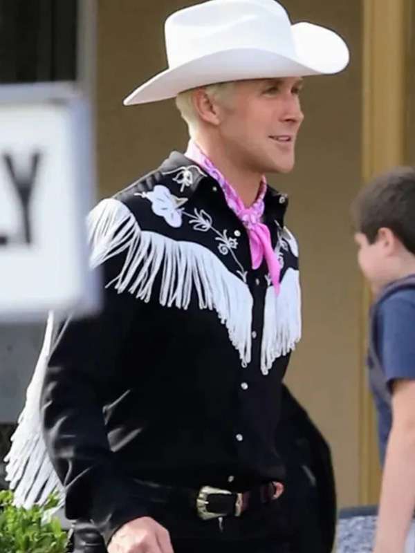 Barbie 2023 Ryan Gosling in a cowboy jacket is a real tribute to his legendary sense of style. Exquisite attention to detail defines the jacket, incorporating traditional Western characteristics such as yoke shoulders, fringe trimming, and a prominent high collar. The jacket transports viewers on a visual tour of the American West and epitomizes tough charm.